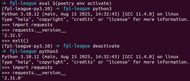 See when I enter the venv I am using the package dependency of “requests (>=2.32.5,<3.0.0)”