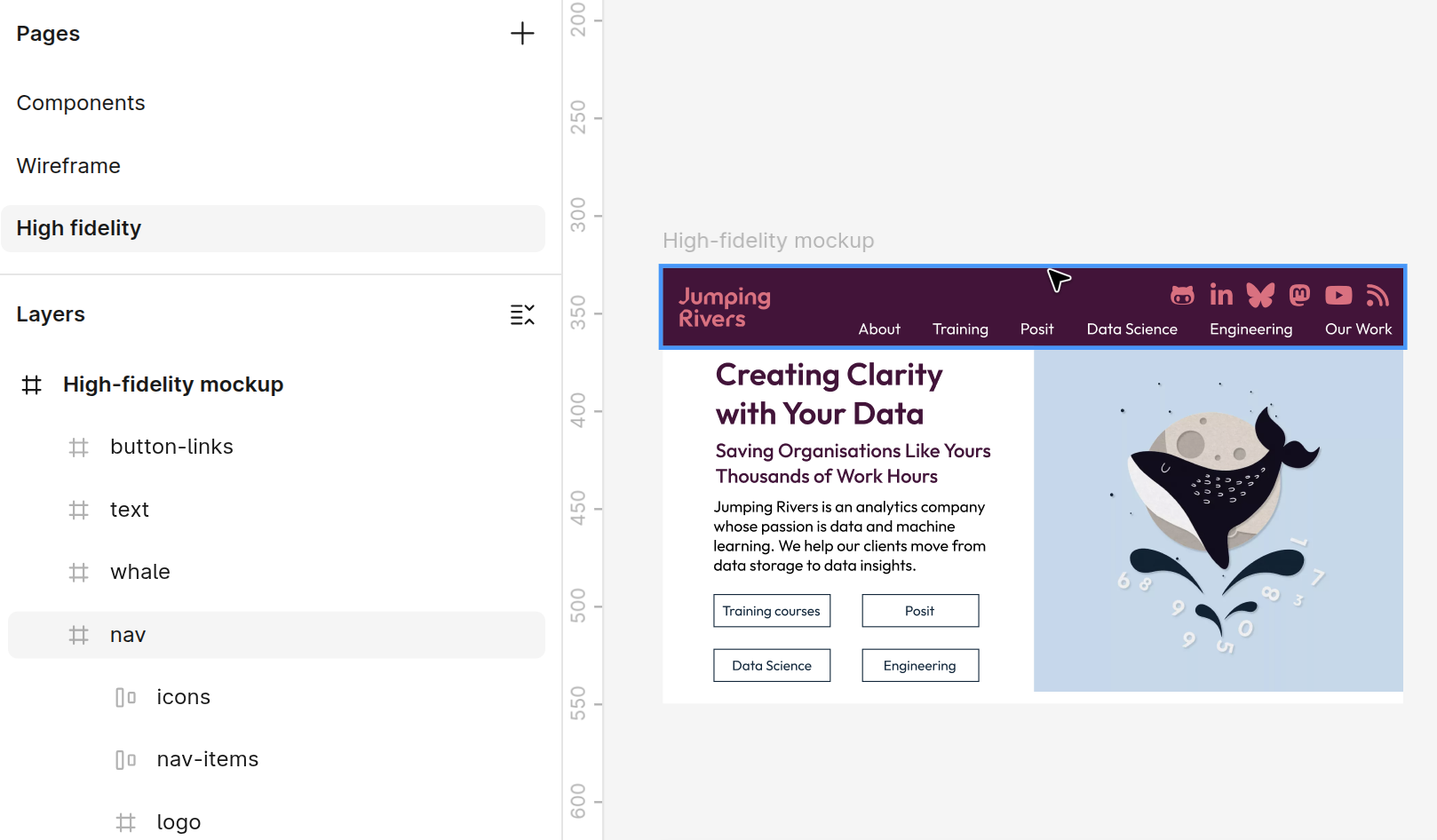 The things you’ll use most in Figma Design, alongside the ubiquitous Move tool, are almost certainly the Frame tool and the Text tool. These may not sound very exciting but you can get a long way using only these. Much of their power comes from the ability to finely customise the look of frames (essentially containers for stuff) and text and to build complex layouts by combining and nesting items you’ve created. Frames can also be filled with images, so while there is a separate Image/video tool, you don’t actually need to use it to create your high-fidelity mockups. This is illustrated below, where the top of the Jumping Rivers home page has been recreated using only the Frame and Text tools.